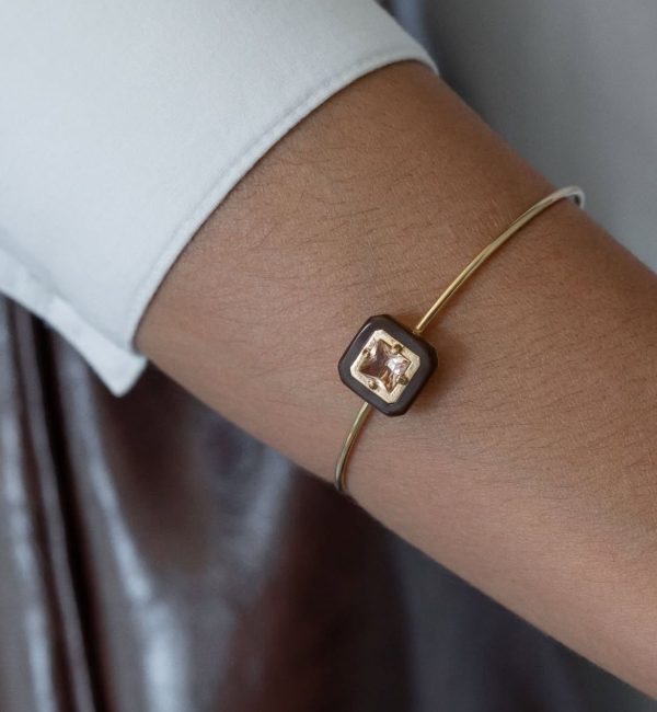 Em até 10x de R$ 38,79 sem juros Pulseira Banho Ouro 18k – Aro Liso com Acrílico Quadrado e Zircônia Champanhe