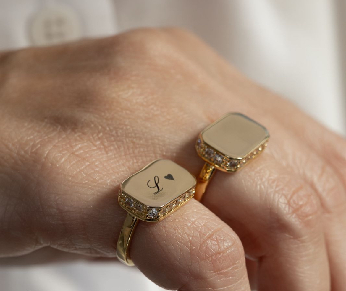Anel Regulável Banho Ouro 18k – Placa Lisa (Pode ser Personalizada) com Cravado em Zircônias Transparentes