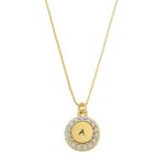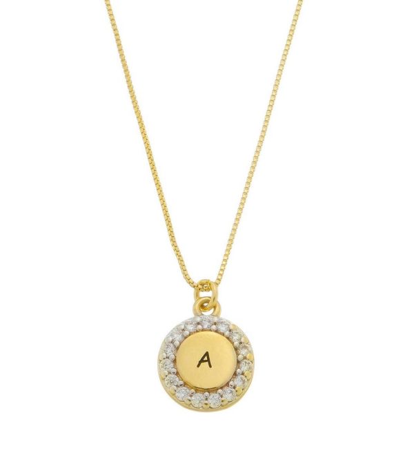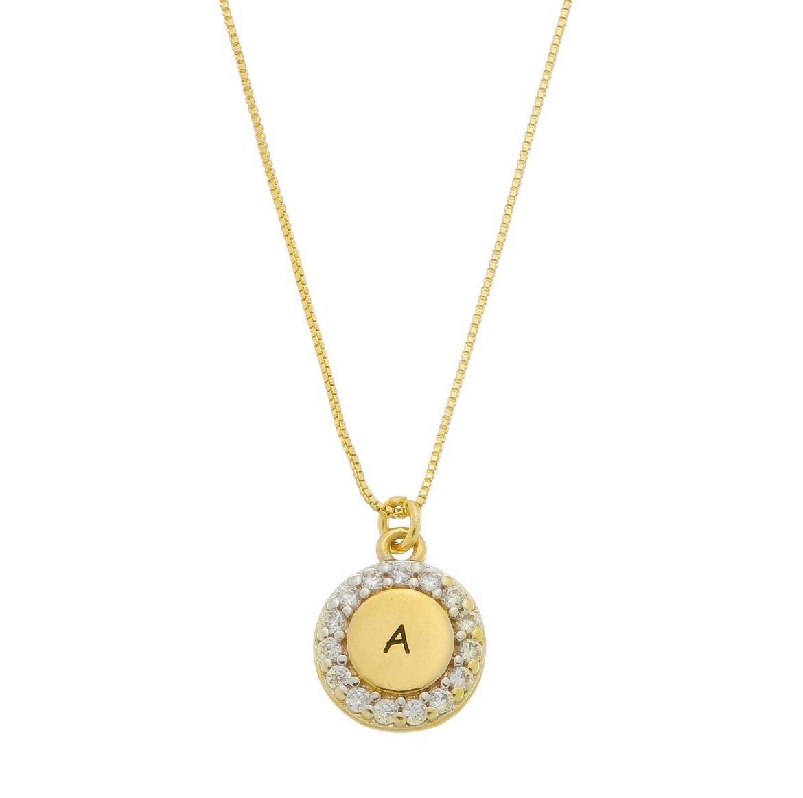 Colar Banho Dourado – Pingente Redondo Letra em Betume Preto Cravado Micro Zircônias Transparentes