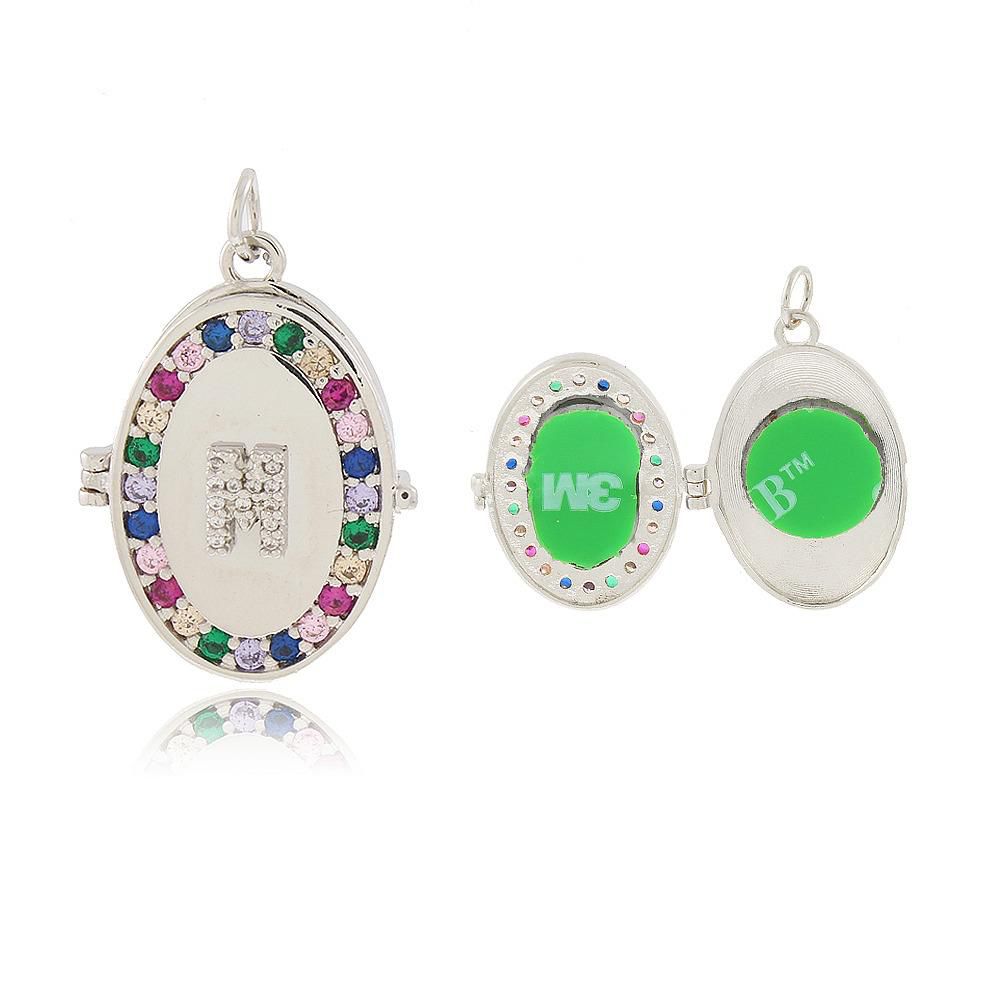 Pingente Relicário Oval Banho Ródio – Pingente Cravado em Zircônias Coloridas e Letra em Alto Relevo Cravado em Micro Zircônias Transparentes